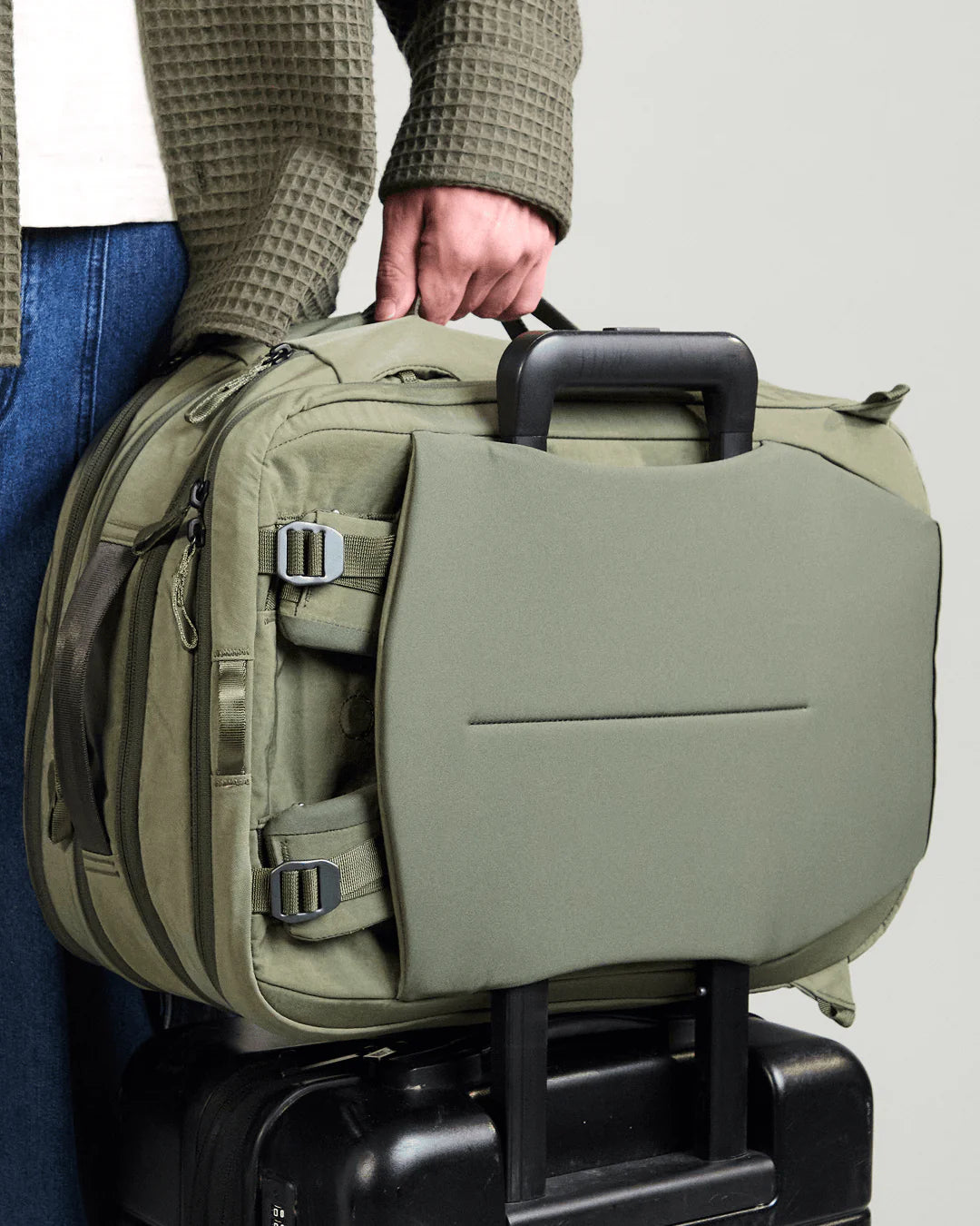 Give your back a break. Use the luggage pass-through to slide the bag onto the handle of a rolling suitcase.